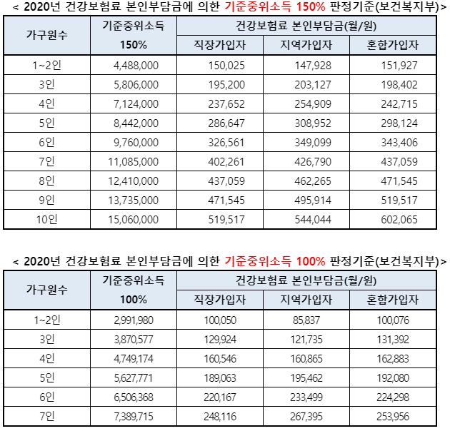 2020년 건강보험료 본인부담금에 의한 기준중위소득 100% 판정기준
