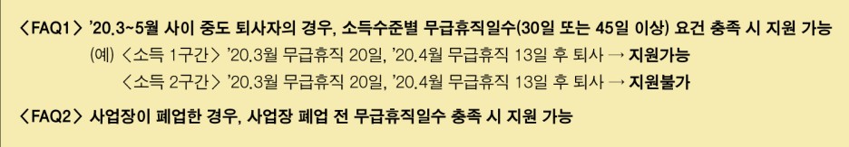예시: (소득1구간) ’20.3월 무급 휴직 20일, ‘20.4월 무급휴직 13일 후 퇴사 ➜ 지원가능